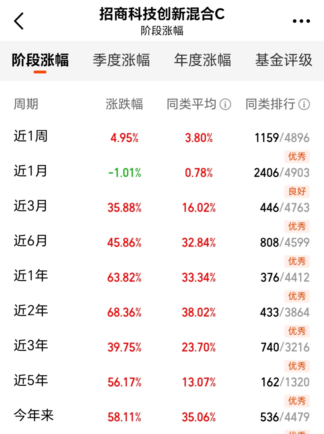 $招商科技创新混合C(OTCFUND|008656)$业绩优秀,近3个月涨幅35.88%,近6个月涨幅45.86%,近1年涨幅63.82%,今年以来涨幅58.11%,超额收益十分明显,该基金主要聚焦新质生产力,随着中国经济转型和产业升级,科技领域的优质企业将会不断发展壮大,未来业绩增长潜力巨大。