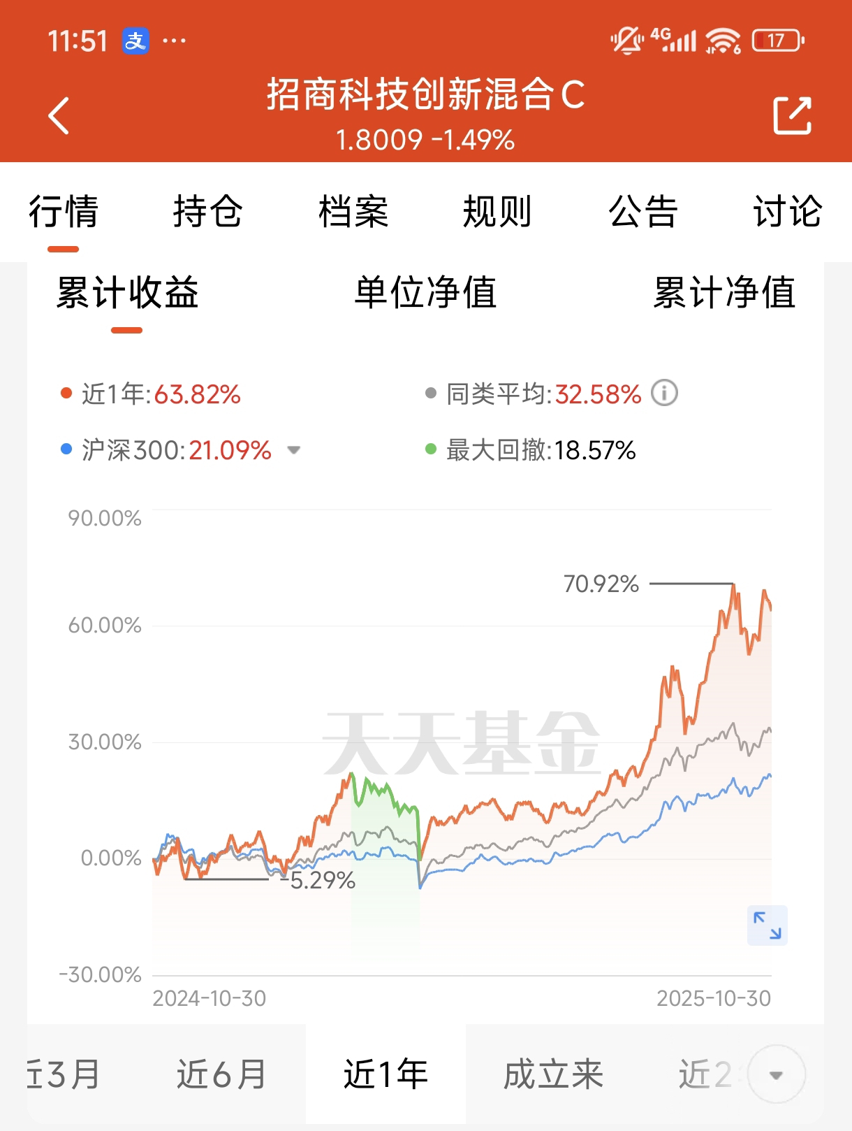 前期科技股涨幅那么大,只可惜我错过了。那这一次科技股又迎来了调整,这一下调整完毕可以重新介入上车吗?我觉得在这个2025年科技的大年,大家对科技股的信任还是非常强的,所以说我觉得调整一下后面应该还能冲高。我的$招商科技创新混合C$ 近一年涨了63.82%,近一周涨了4.95%,太给力了