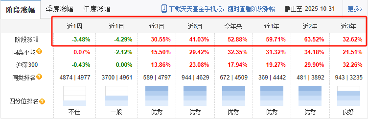 截至 10 月 27 日,这只基金今年以来收益 52.88%,近一年涨了59.71%,在4442只同类基金里排 369 名,能长期跑赢平均水平,说明选股和择时都有真功夫。