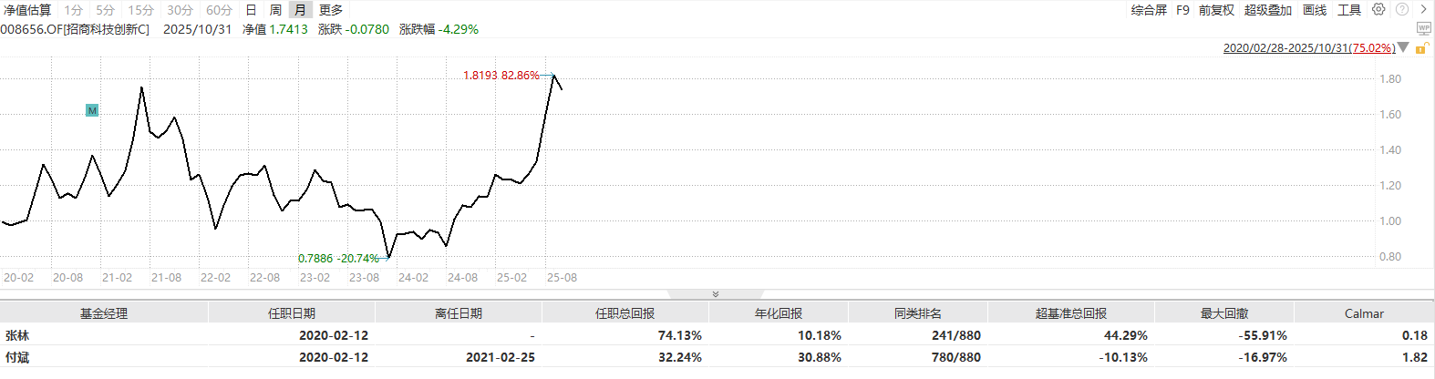 他自2020年2月12日掌舵的招商科技创新混合C(008656),截至2025年10月31日,任职期间总回报74.13%,复合年化回报率10.18%,居同类基金前10%,期间最大回撤55.91%。基金定位投资中国战略新兴产业,三季报显示重点投资了AI芯片和AI应用龙头股。