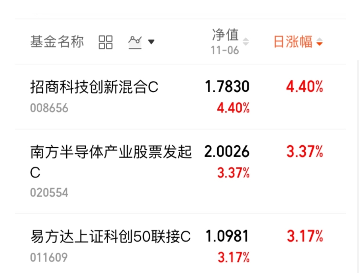招商科技创新混合(008656)昨天大涨4.4%,南方半导体产业股票(020554)也有3.37%的涨幅,易方达科创50联接(011609)上涨3.17%。虽然今天市场又回到震荡走势,但科技板块昨天的强势表现还是让我对这个方向保持关注。这些基金覆盖了科技创新、半导体等成长性较强的领域,近期的反弹也显示出资金对科技板块的关注度在提升。