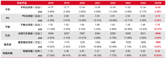 下游应用主要集中在以下的消费电子产品,经历过2020-2021年的需求高增长后,2022-2023年全球在疫情冲击下需求大幅度回落,2024年整体上有5-15%的需求复苏,预计2025年下游需求会继续回暖,细分赛道看,智能穿戴、智能家居、AI服务器的增速或将更高。