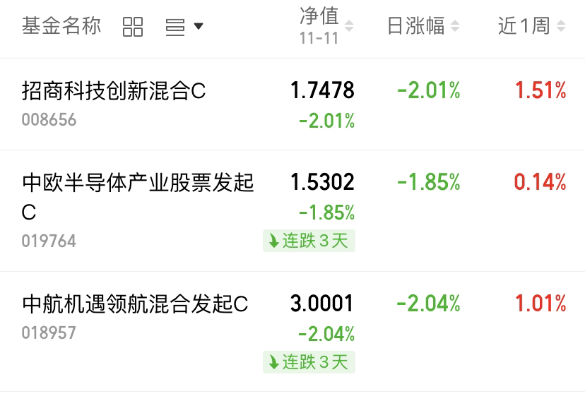 昨天行情,金融、科技、大消费、周期板块都在调整。集体大涨的大消费昨日出现分化,科技板块更是高开低走有的迹象,这波走势让市场信心明显受影响。我查找了3只近一周防守还不错的科技基金,$招商科技创新混合C(OTCFUND|008656)$近1周上涨1.51%,$中欧半导体产业股票发起C(OTCFUND|019764)$上涨0.14%,$中航机遇领航混合发起C(OTCFUND|018957)$上涨1.01%。