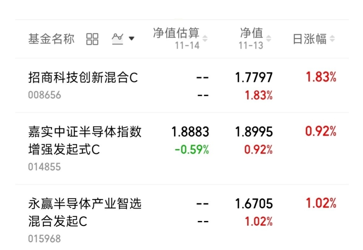 我关注的几只基金昨天表现还行,招商科技创新混合C涨了1.83%,嘉实中证半导体指数增强发起式C涨了0.92%,永赢半导体产业智选混合发起C也涨了1.02%。希望今天能低开高走,最后收个红盘吧。