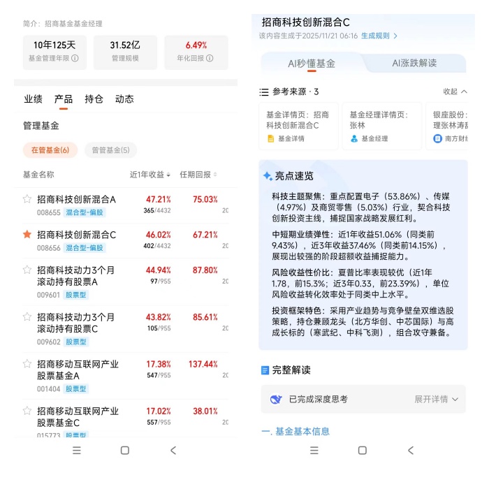 自从张林经理2021-02-25单独管理$招商科技创新混合C(008656)以来,4年又270天时间回报26.44%,发行初期与付斌共同管理的1年又16天任期回报32.24%,收益高低与时间长短不是成正比例关系的,市场环境好的时候收益率会更高,赚钱更轻松。在四年时间里,依次年度收益率是2021/17.82%优秀、2022/-27.69%一般、2023/-5.69%优秀、2024/14.36%优秀,在复利效应下,长期收益很明显靠前的,期间的波动谁能精准绕开?因此, 张林经理以“产业趋势洞察+深度基本面研究”为核心,长期耕耘泛科技领域,坚持做科技成长的“同路人”实现了基金管理的成长目标,是基民引以为鉴的绝佳例子。在我看来,成功不是一挥而就,而是在对的方向不断努力,时间长了就会达到目标。