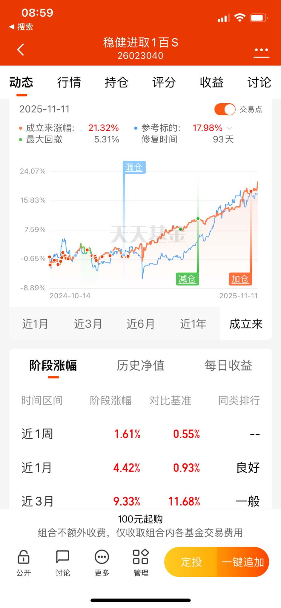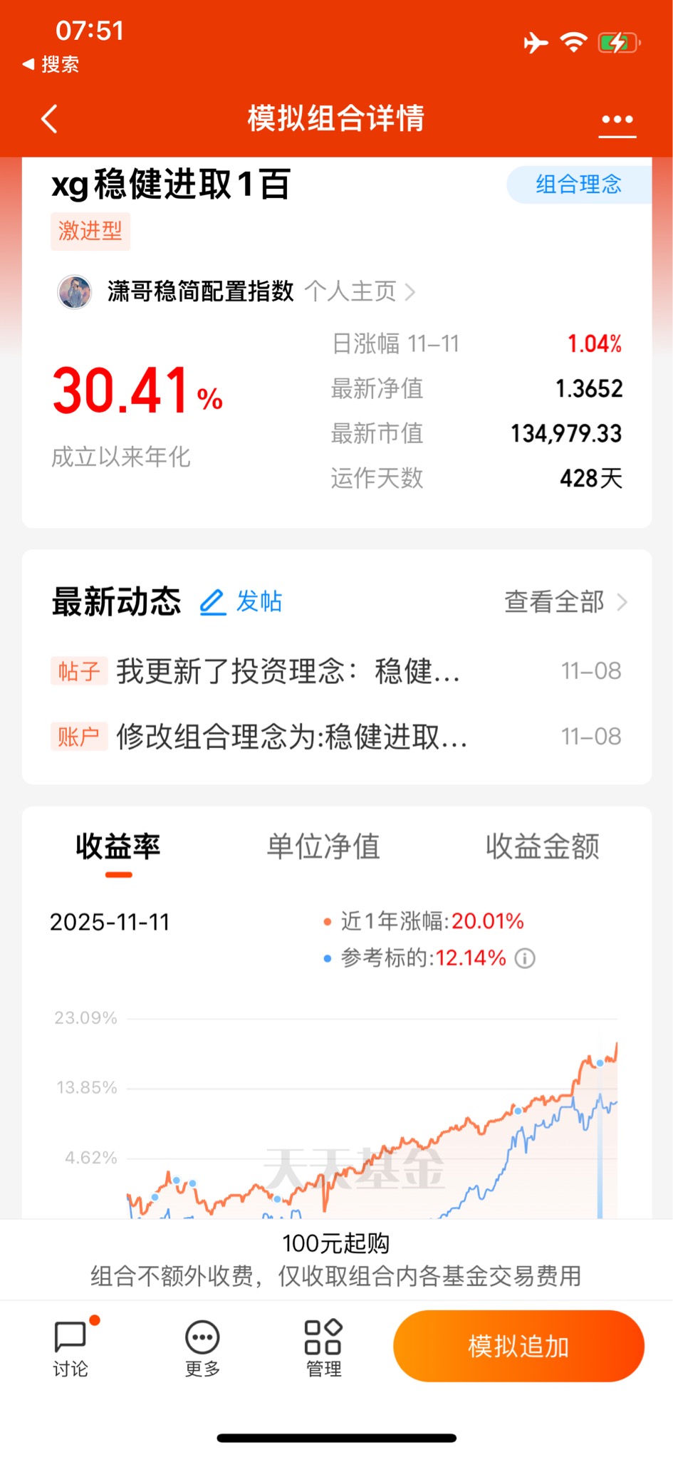 模拟组合:模拟组合是在2024年9月10日成立以来428天收益36.52%、年化30.41%、近一年最大回撤幅度-5.64%。估计成立以来恰逢股市上涨阶段,运气有点好吧。