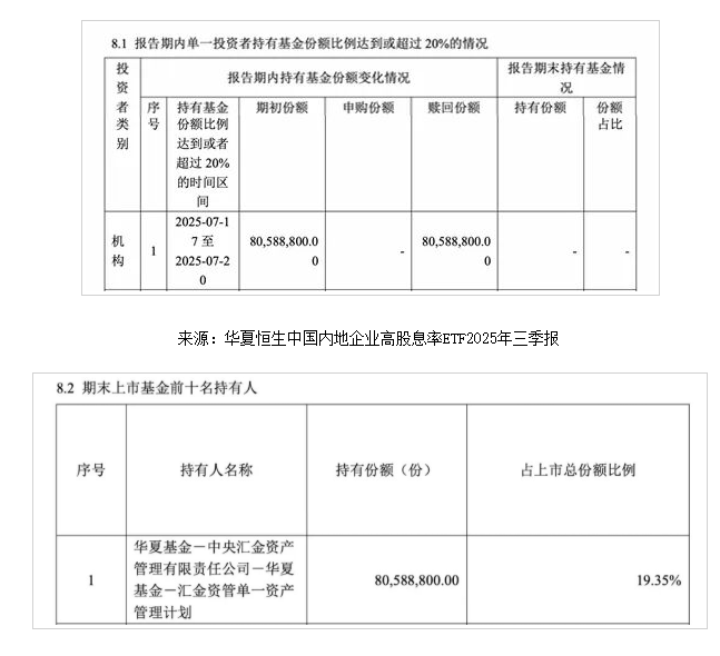根据2025年基金中报,华夏基金旗下汇金资管专户二季度末持有8058.88万份华夏恒生中国内地企业高股息率ETF,同时也是第一大持有人,持有比例为19.35%;2025年基金三季报显示,“机构1”将持有的8058.88万份该ETF全部清仓赎回。由此可见,“机构1”即为华夏基金旗下汇金资管专户。