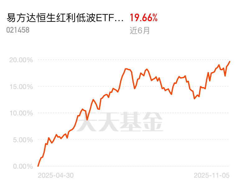 港股的估值处于历史相对低位,加上资金持续加仓,长期投资价值凸显。易方达恒生红利低波联接C表现给力,近6个月收益19.66%,费率特别低,能有效降低投资成本,稳健型投资者可以入手。$易方达恒生红利低波ETF联接C$