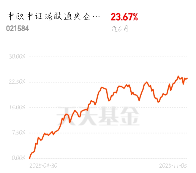 港股市场正在迎来多重利好,全球流动性宽松加上南向资金流入,央企板块迎来好时机。中欧中证港股通央企红利指数(QDII)C近6个月涨了23.67%,聚焦央企红利赛道,让普通人也能参与这波行情。
