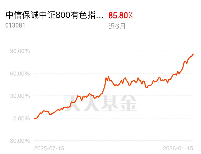 有色板块五连阳气势如虹,开盘领涨全场,行情超火爆。中信保诚中证 800 有色指数 (LOF) C 近 6 月涨幅 85.80%,重仓稀有金属标的,贴合新兴产业需求,讨论区福利红包还在,抓紧参与。$中信保诚中证800有色指数(LOF)C$