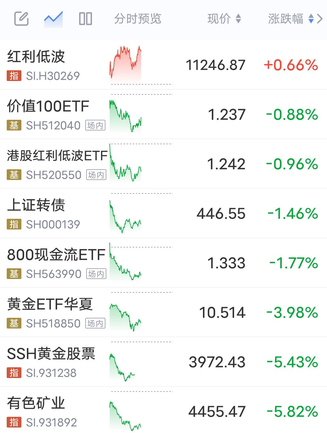 红利低波一点朱,其它板块全绿