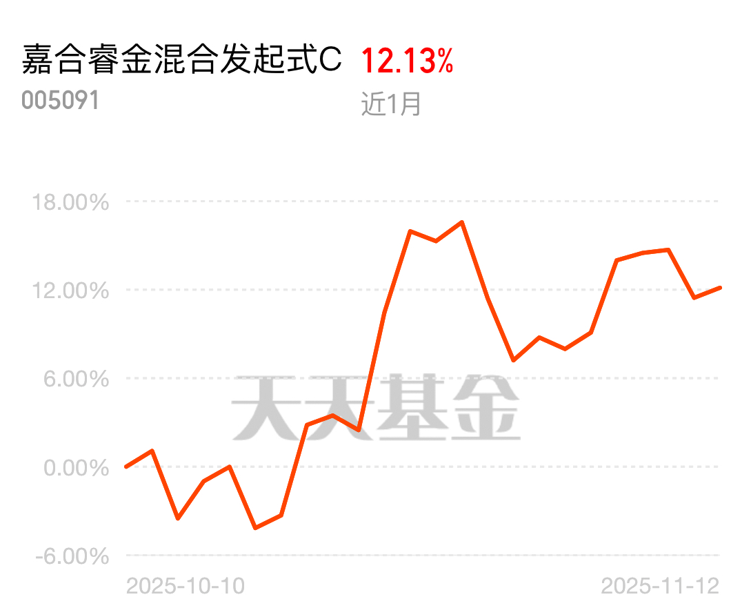 最近科技板块的行情全面爆发,CPO和存储芯片更是涨得如火如荼,市场情绪高涨。嘉合睿金混合C踩中这波行情,近一个月收益12.13%,跟着市场情绪走,赚钱效应拉满。