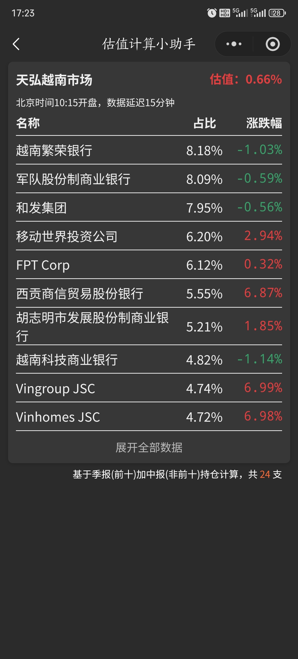 $天弘越南市场股票发起(QDII)C(OTCFUND|008764)$ $越南胡志明(QQZS|VNINDEX)$ $振华科技(SZ000733)$ 越南基有点拉,有指数的一半涨幅,还行吧,振华科技错过了商业航天这波风口浪尖的行情,看好补涨,个人看法仅供参考