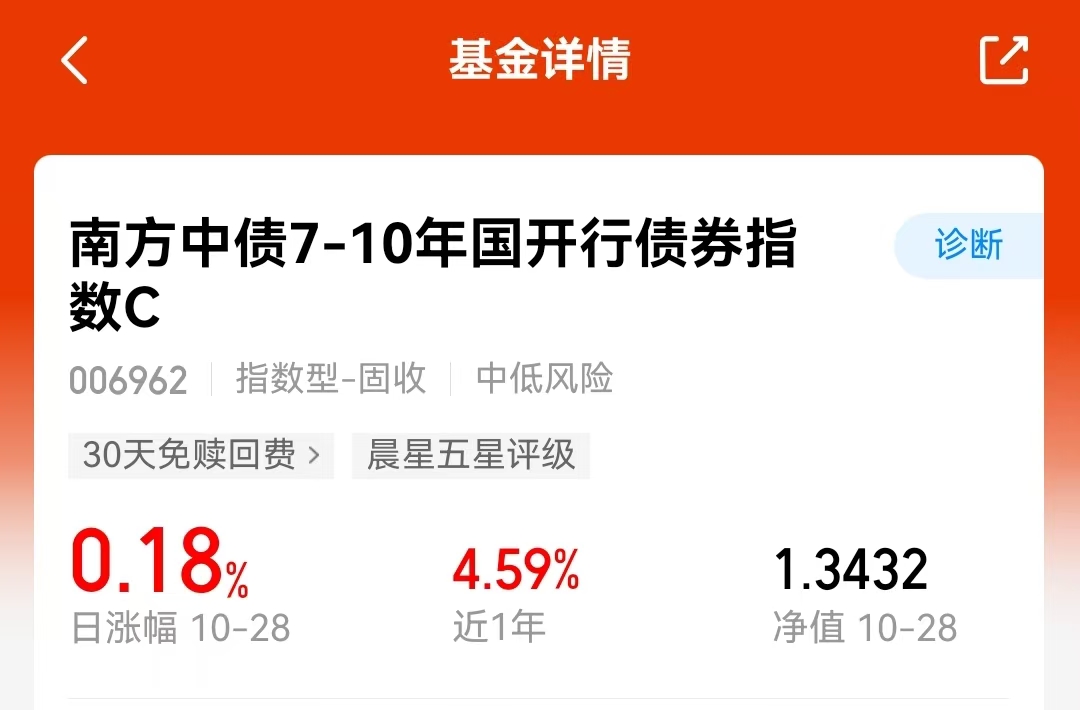 最近市场热闹是热闹,但仔细看看自己的账户,会发现波动实在太大了。这时候再看看像$南方中债7-10年国开行债券指数E$(013594)这样的产品,反而觉得心里踏实不少。它主要投资的是高信用等级的债券,波动小,走势稳,跟市场的联动性不高。数据显示,近一年的收益率有4.42%,近三年累计涨了16.65%,虽然不像某些资产那样短期爆发,但年年都是正收益,长期下来复利效果一点也不差。#科技热点摊开业啦#