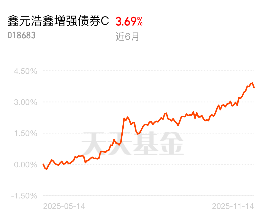 现在债市不少产品波动让人没底,想求稳又想有点收益的朋友可以看看鑫元浩鑫增强债券C,近6个月收益有3.69%,不用承受大起大落,日常零花钱、备用金放这儿,稳稳增值挺安心。