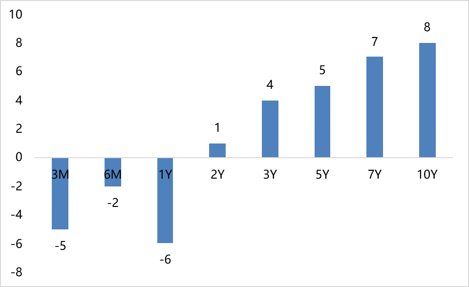 上周美债各期限收益率涨跌不一。上周10年期美债收益率上行8BP,10年期国债收益率上行1.19BP,中美利差倒挂程度扩大。全周来看,1年期美债收益率下行6BP,3年期美债收益率上行4BP,10年期美债收益率上行8BP。