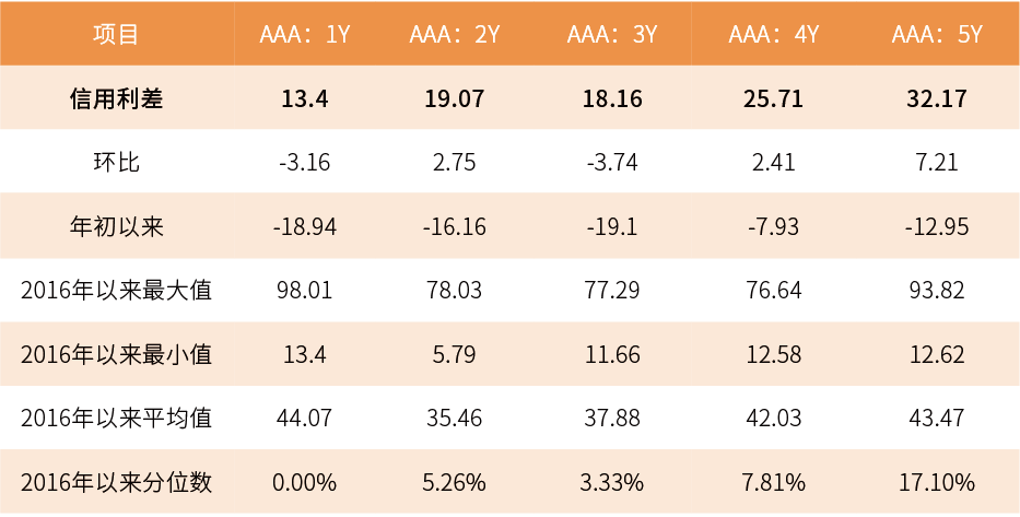 长期限高等级票据信用利差走阔居多。中债1年期AAA级中短期票据信用利差收窄3.16BP,中债2年期AAA级中短期票据信用利差走阔2.75BP;中债3年期AAA级中短期票据信用利差收窄3.74BP。