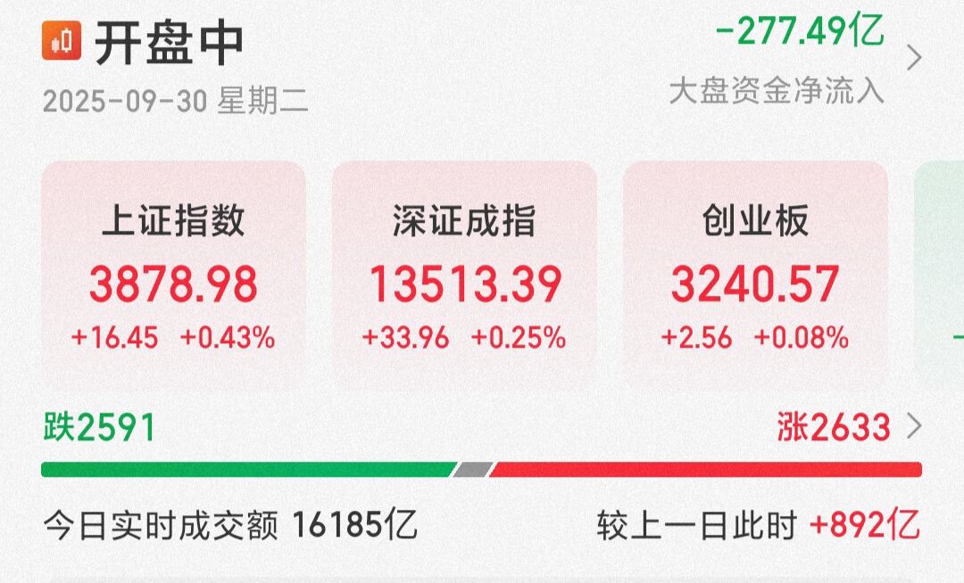 今天是国庆假期前最后一个交易日,虽然牛市旗手券商表现不佳,但是其他板块表现还不错,半导体、军工、有色谨慎大幅上涨,新能源、医疗表现也不错,三大指数也是延续上涨,技术上看,量能较昨日增加了不少,成交还是非常活跃的,上证指数走势良好,并且整个9月份上证指数其实反复震荡,已经修复的差不多了,目前短线指标KDJ也不高,券商在昨天突然发力,也是一个好现象,大盘短线存在继续上攻3900点的可能性。