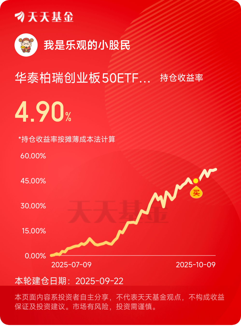 观察到$华泰柏瑞创业板50ETF联接C$ 近三个月收益率达51.72%,明显跑赢大盘。这说明在科技主线中,选择核心指数长期持有才是明智之举。#晒收益#