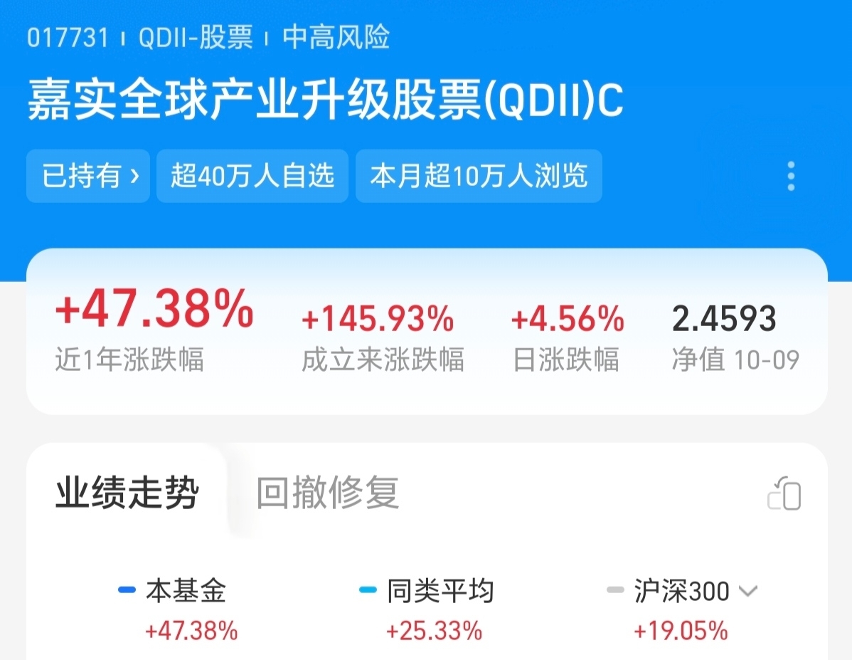 国庆期间收益来了,非常不错,嘉实全球产业升级股票(QDII)C$嘉实全球产业升级股票发起式(QDII)C$ 更新涨4.56%,主要投资全球产业升级领域的基金,股票持仓占比86.79%,主要重仓英伟达、新思科技等半导体龙头企业。近1年涨幅47.38%,成立以来涨幅145.93%,业绩同类排名优秀。