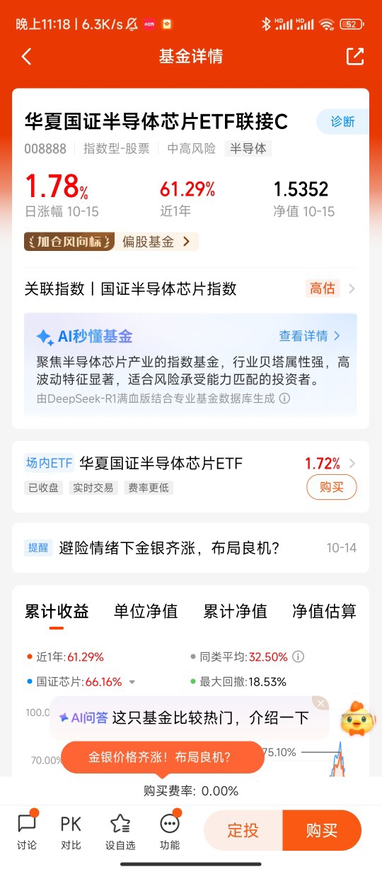 旅途见闻让我更加坚定了四季度布局半导体板块的逻辑,而华夏国证半导体芯片ETF联接C正是践行这一逻辑的优选。作为跟踪国证半导体芯片指数的工具型产品,它覆盖了芯片设计、制造、设备、材料等全产业链关键环节,能帮助投资者一键捕捉产业红利,避免个股分化带来的风险。从产品数据看,尽管近3个月波动率达42.02%,体现了半导体板块的高弹性特征,但10月以来半导体指数在波动中稳步上行,10月15日单日涨幅达1.38%,印证了板块的景气度。