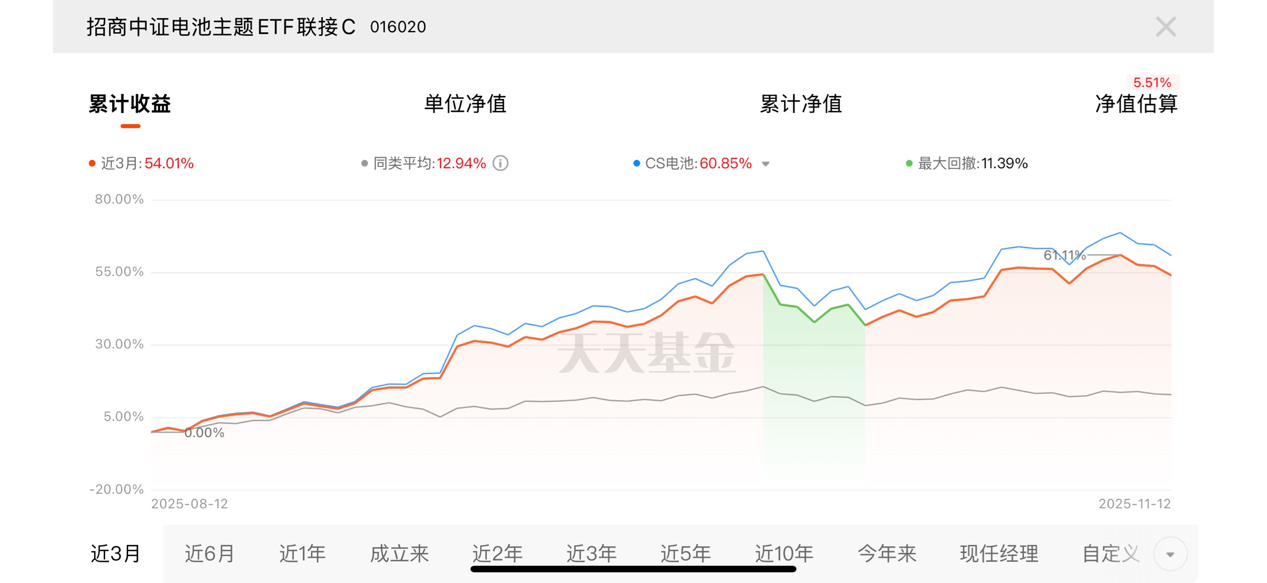 新能源市场持续升温,电池板块作为核心赛道,受到资金的热烈追捧,行情一路向好。招商中证电池主题ETF联接C近3个月涨了54.01%,今日继续上行,储能和固态电池技术突破,行业明年高增长可期,中长线值得布局。