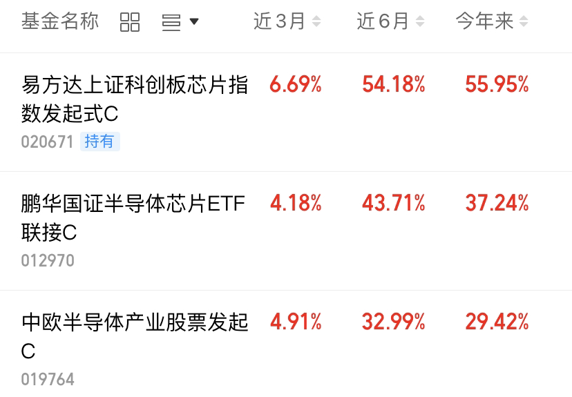周一原本以为市场会悲观,没想到 A 股低开后接着反弹。科技方向探底回升,芯片板块弹性挺不错。易方达上证科创板芯片指数 C,紧紧跟踪科创芯片产业指数,业绩表现优秀,盈利能力强,近 6 个月涨幅达 54.18%,未来值得期待。我继续看好芯片这个方向,大家可以珍惜回落的布局机会!