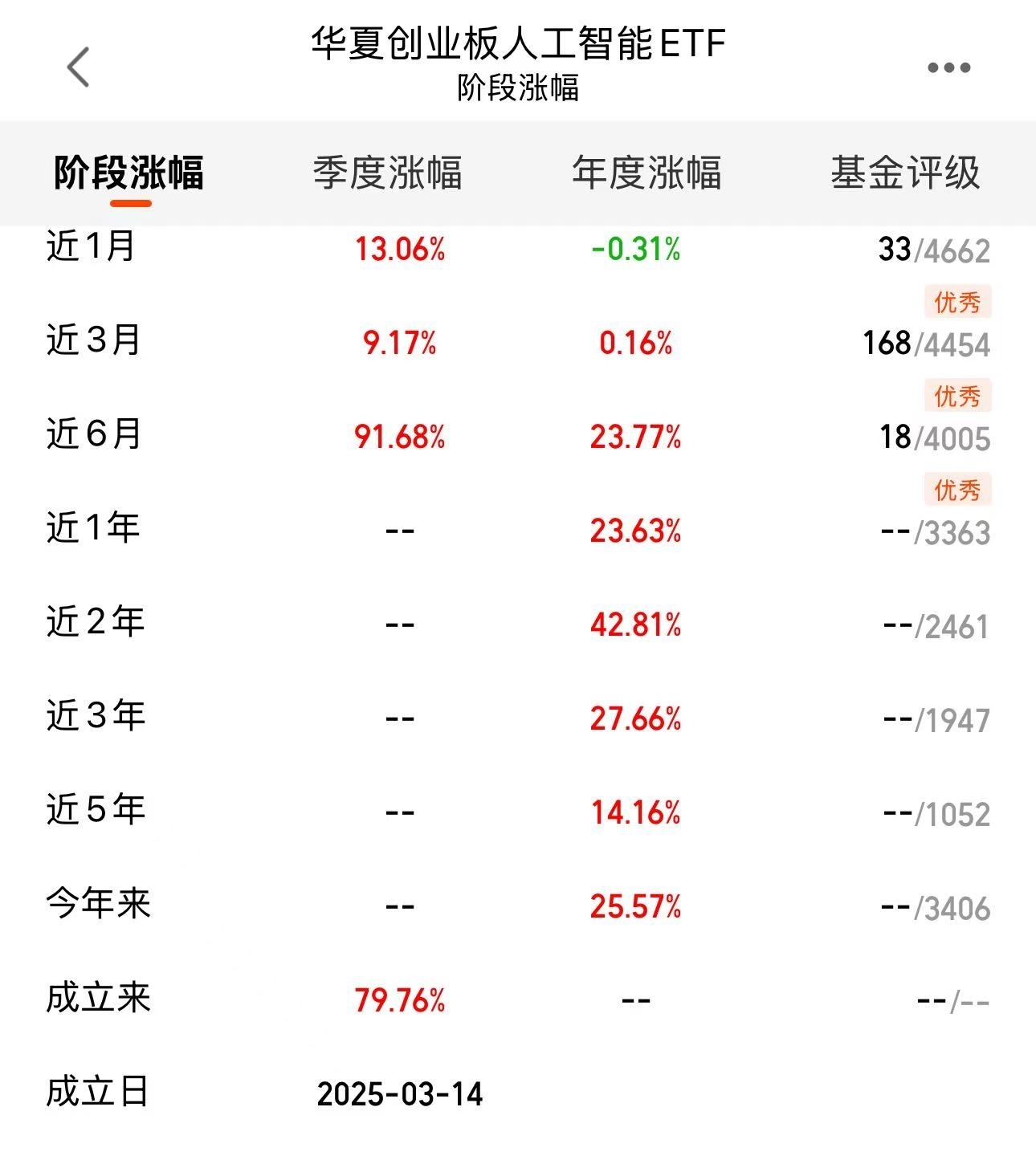 今年的人工智能收益很强,这基成立才3个多月,场内近6个月收益91%+,场外收益应该也会$华夏创业板人工智能ETF发起式联接C$更上一层楼吧