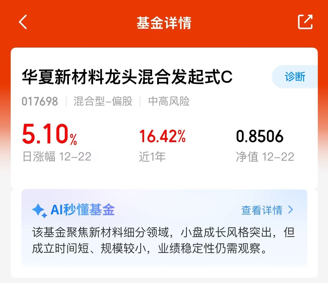 市场情绪回暖,新材料赛道这是起飞了啊,$华夏新材料龙头混合发起式C$今天涨5.10%,本周这么大的开门红,看样子后面反弹稳了,明天开门我再来加,就等一个长牛了