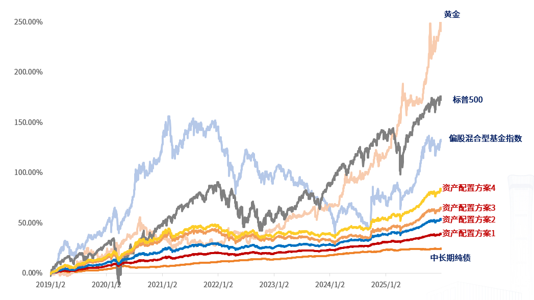 方案1:90%中长期纯债+5%偏股混合+2.5%黄金+2.5%标普500