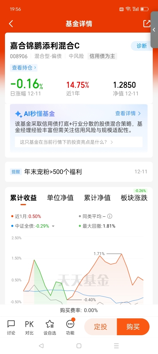 我选择【五星基金】$嘉合锦鹏添利混合C$的理由:这只偏债混合型基金主投信用债,还
