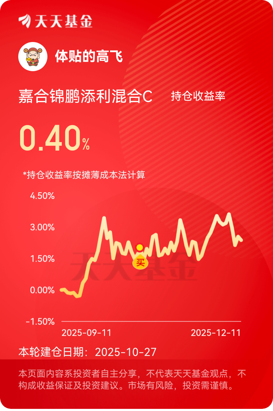 "固收+"不是稳赚不赔的魔法,找到好的基金就成功了一大半,是不是这个道理呢?$嘉合锦鹏添利混合C$ ,有优秀的业绩和优秀的基金经理,一定能成为你理财路上的得力助手。#晒收益#