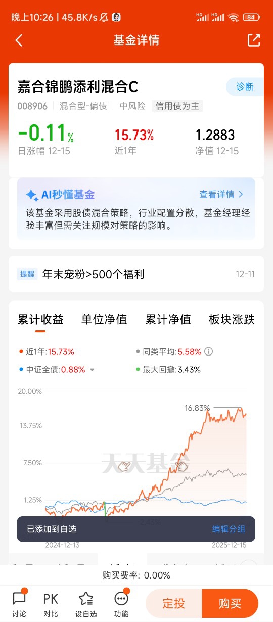 #12月基金投资策略# @往事如风景 我选择嘉合锦鹏,核心是看中其“稳中有进”的核心优势。作为优质“固收+”产品,它以高等级债券为底仓,叠加高频套利策略增厚收益,风险控制扎实。双基金经理于启明、季慧娟均是从业超10年的“金牛老司机”,配合默契且投研经验深厚。过往业绩亮眼,2022年同类排名前三,历经市场震荡仍能实现中长期绝对收益,净值波动远低于同类。对追求稳健回报、不愿承受股市大幅波动的投资者来说,是平衡收益与风险的优质选择。$汇添富中证电池主题ETF发起式联接C$ $工银新经济混合(QDII)人民币A$ $财通集成电路产业股票A$