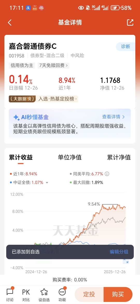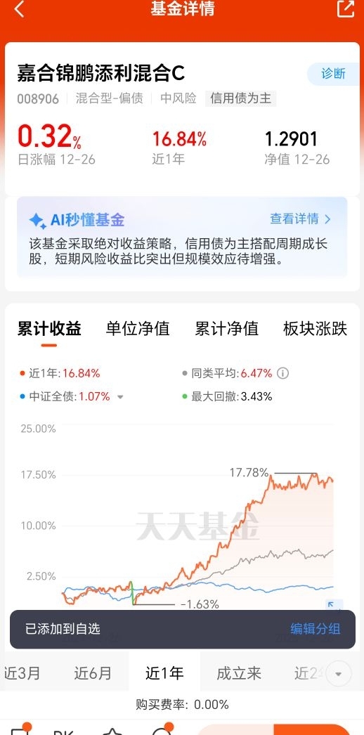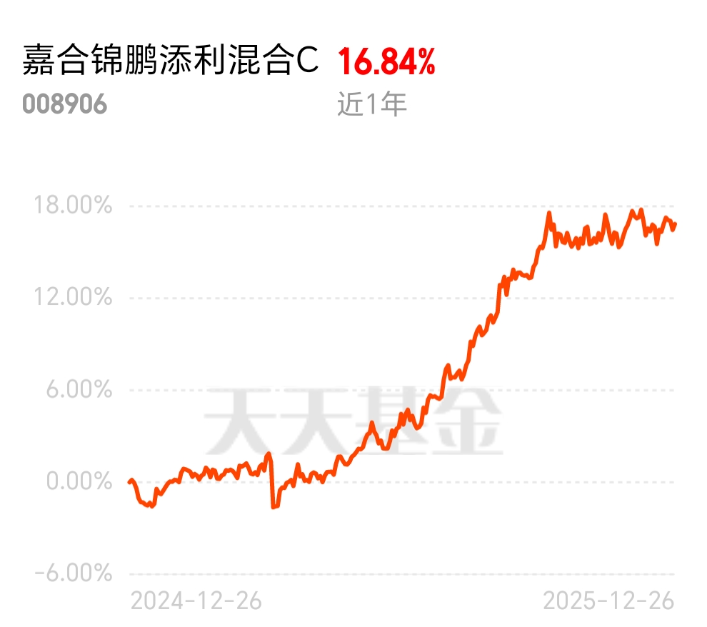在A股震荡加剧、市场不确定性上升的环境下,我将嘉合锦鹏添利混合C作为核心配置标的,核心源于其“固收打底+权益增强”的均衡策略、明星基金经理的专业把控,以及在收益与风险之间的出色平衡,完美契合稳健型投资者“稳中求进”的核心诉求。