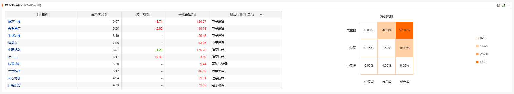 2、基金持仓。基金主要集中在半导体、通信设备、电子元件等科技制造领域 。前十大重仓股为源杰科技、天孚通信、生益科技、德科立、中际旭创等 ,这显示出基金经理对科技细分领域的深入布局。
