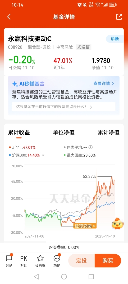 翻看这只基金的业绩,李文宾管理以来63.95%的收益(数据截至2025/10/31)、近一年同类排名258/1460的成绩,更让我坚定了信心。它聚焦AI和军工这些高景气主线,既踩准了科技发展的大趋势,又不会因为短期热点切换而乱了阵脚。我从三个月前开始定投,每次发工资后自动扣款,不用天天盯盘猜涨跌,反而心态更稳了。