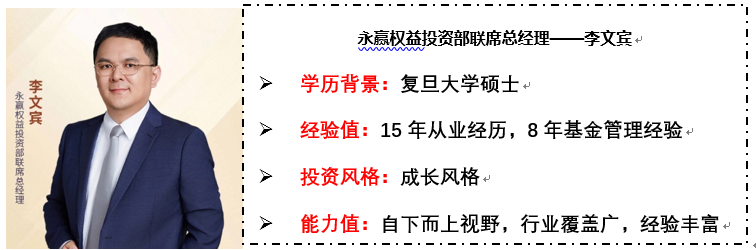 经理李文宾为权益投资部联席总经理,拥有15年从业经历,8年基金管理经验,凭借自下而上视野,能力圈覆盖多领域行业。