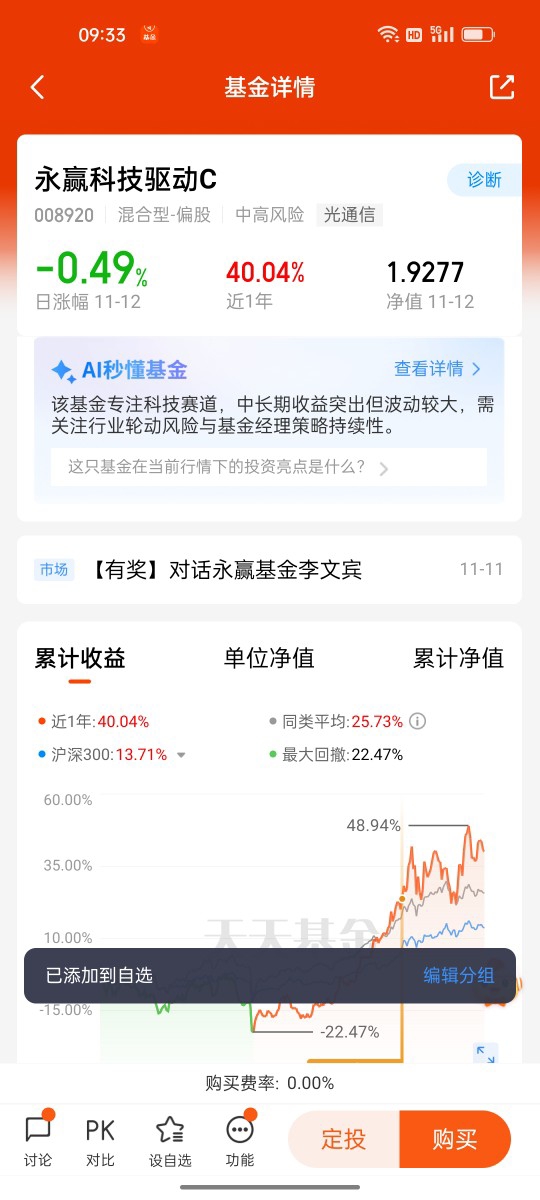对咱们普通人来说,买基金还有个好处:不用自己研究行业、选股,基金经理和他的团队会帮着做这些专业的事,还能把钱分散投到好几家公司,就算某一家公司跌了,对基金的影响也不大,风险小多了。$永赢科技驱动C$ 还有个优点,C类份额不用交申购费,持有超过7天还免赎回费,长期拿着特别划算。我已经把这只基金加入自选好久了,每天都会看看它的净值变化,也会关注基金季报里的持仓调整。我发现李文宾调整持仓的时候,都是跟着行业趋势走,不盲目追热点,也不固守着某几只股票,这种灵活又稳重的风格,让我越来越放心。