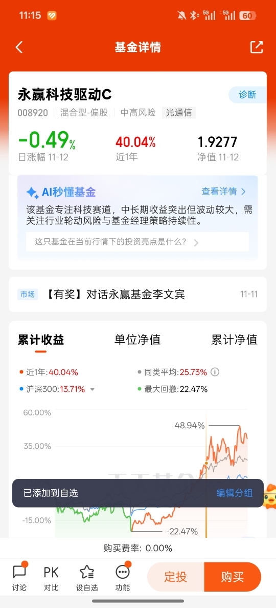 该基金C类份额零申购费,综合费率适中,适合中短期持有或定投。其股票仓位集中于科技领域,策略上兼顾成长与风险对冲,适配看好科技长期趋势、能承受阶段性波动的投资者。@永赢基金