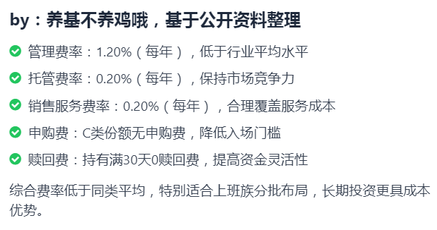 对于我们上班族来说,投资不仅要赚钱,还要省心省钱,这只基金的费率设计简直是为普通人量身打造的。C类份额没有申购费,这意味着我们可以随时分批加仓,不用为了节省费用而一次性重仓,特别适合在市场震荡中逐步布局。而且持有满30天就免赎回费,就算后续有资金需求,也能灵活退出,流动性完全有保障。