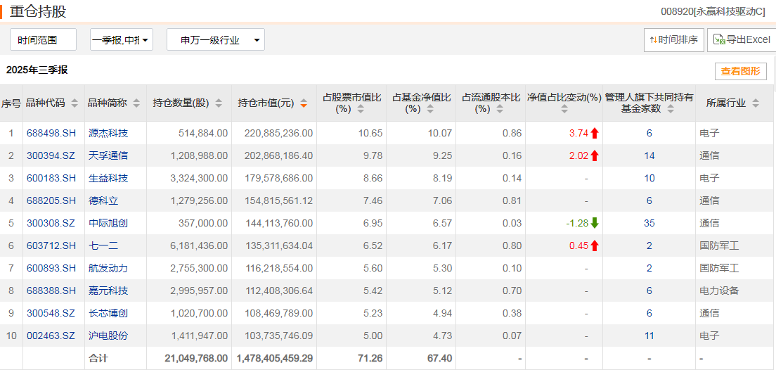 前十大重仓股体现了"核心技术+成长确定性"的选股标准:光通信集群化配置(源杰、天孚、中际、德科立合计占比33.94%):紧扣AI算力基建主线,覆盖芯片-器件-模块全产业链。全球数据中心400G/800G升级周期持续3-5年,头部厂商技术优势与客户壁垒难以撼动。