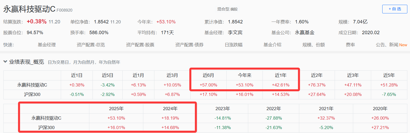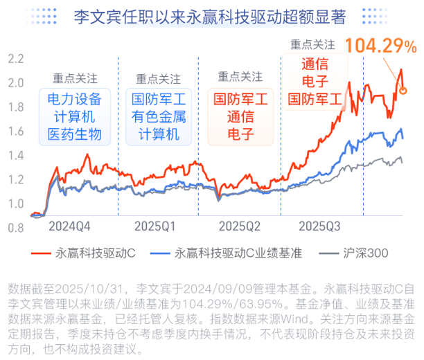 在评估一位基金经理的投资能力时,持续且显著的超额收益是最具说服力的指标。李文宾经理的代表作——$永赢科技驱动C(OTCFUND|008920)$ 自其于2024年9月9日接管以来,展现出了惊人的爆发力。截至2025年11月21日发文,在李文宾经理管理不到15个月的时间里,该基金份额(C类)实现了100% 的惊人回报率。这一成绩不仅大幅超越了同期的沪深300指数表现,也显著跑赢了同类偏股混合型基金平均水平。这份成绩单,充分体现了李文宾经理在科技赛道上的精准把握和强大的主动管理能力。