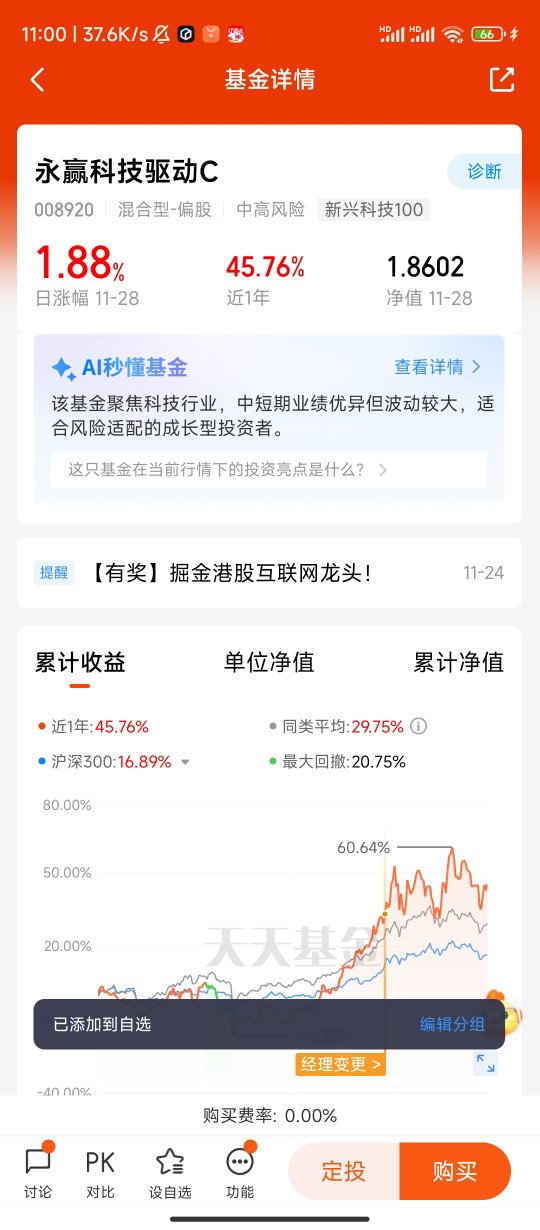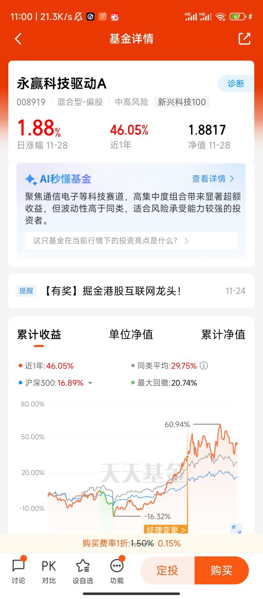 数据显示,截至2025年11月,永赢科技驱动混合C近一年收益率达52.32%,同期沪深300指数涨幅仅17.62%。更难得的是,其最大回撤控制在18.7%,显著低于科技主题基金平均25%的波动率。这种“攻守兼备”的特性,使其成为我资产配置中的核心卫星资产。