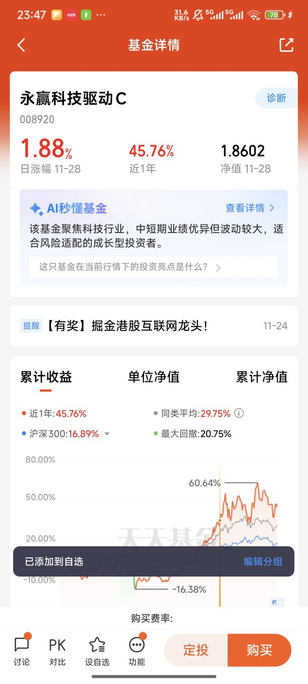 回顾持有体验,最深刻的感受是基金的抗跌性与进攻性兼具。今年10月科技板块出现调整,不少同类基金净值大幅回撤,但这只基金凭借行业分散配置,单周波动率控制在3%以内,远低于同类平均水平。而在11月28日,基金净值单日上涨1.88%,再次印证了李文宾经理精准的选股能力和择时眼光。这也让我总结出一条投资心得:科技投资既要认准产业趋势,更要选对掌舵人。普通投资者很难精准把握板块轮动节奏,而李文宾经理能提前布局低位赛道、在高位精准止盈,比如此前提前减仓光模块板块规避30%跌幅,这种专业判断正是个人投资者所欠缺的。