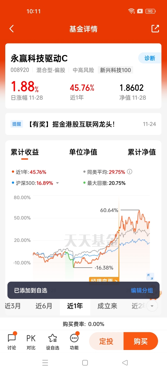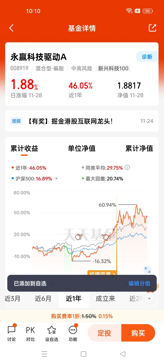 在风险控制方面,李文宾的“动态均衡”策略为基金穿越震荡提供了保障。永赢科技驱动C的股票资产占比控制在60%-95%,既保留了捕捉科技板块红利的弹性,又通过仓位调整应对市场波动;前十大重仓股合计占比仅45.11%,有效避免了单一标的波动对基金净值的影响。这种“聚焦核心+分散风险”的配置思路,让基金在11月科技板块的剧烈震荡中展现出较强的抗跌性,同时在行业回暖时能够快速兑现收益。
