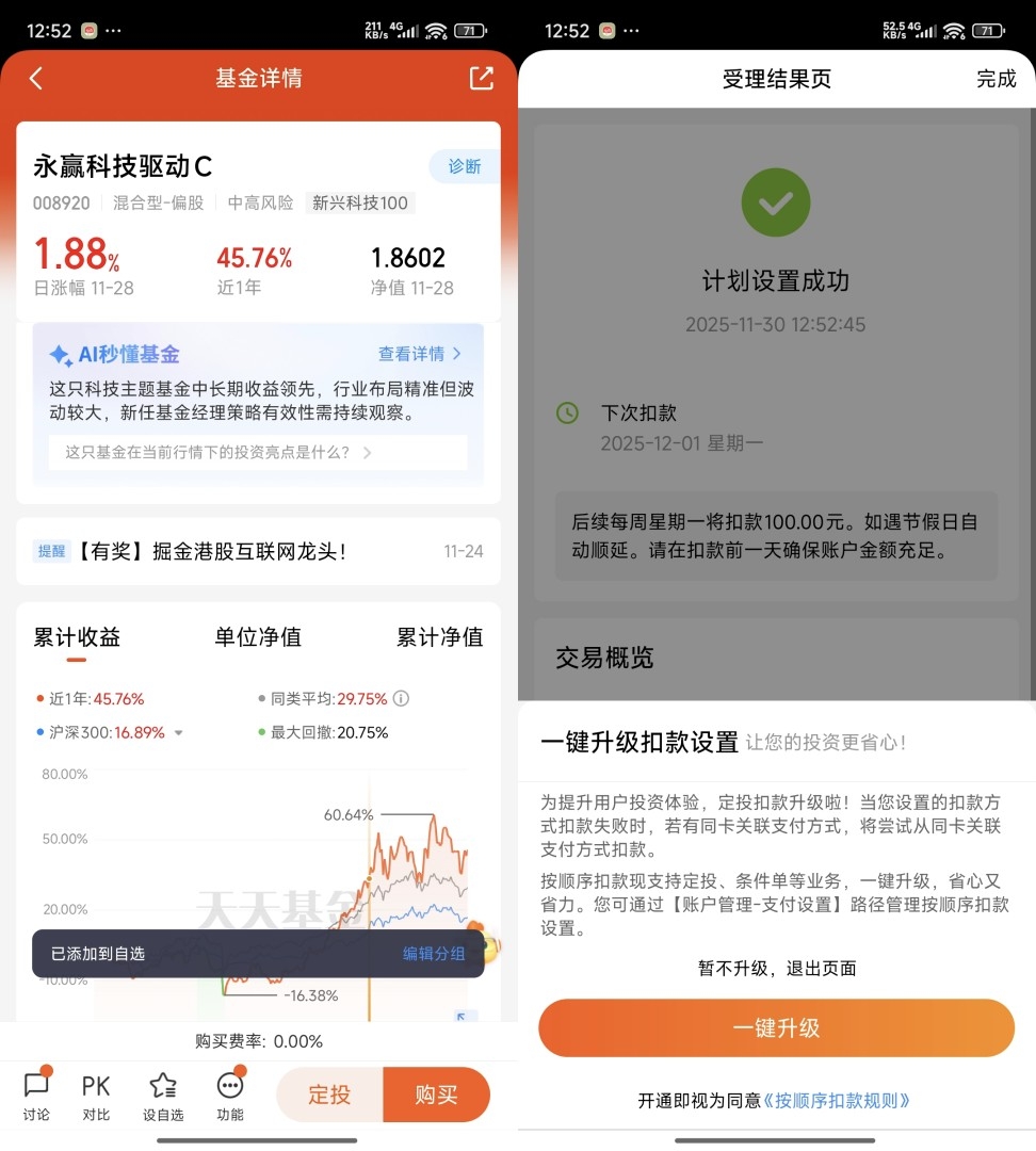 先说说我的真实经历吧!今年5月刚入职,工资除去基本开销只剩几千块闲钱,想理财却完全摸不着头脑。偶然刷天天基金时看到科技板块开始启动,不少基金涨势喜人,但我深知自己没经验,不敢盲目入场,只能默默把几只热门科技基金加入自选。没想到从5月到10月,科技板块一路震荡上行,永赢科技驱动C更是涨得超出预期,期间虽然有小幅回调,但整体趋势稳得离谱。看着它从5月的净值1.2左右涨到10月的1.6+,我既后悔没早点买,又怕现在入场刚好接盘,纠结了整整两个月,直到12月才下定决心设置每周一定投100元,长期持有,相信时间的力量能熨平波动。