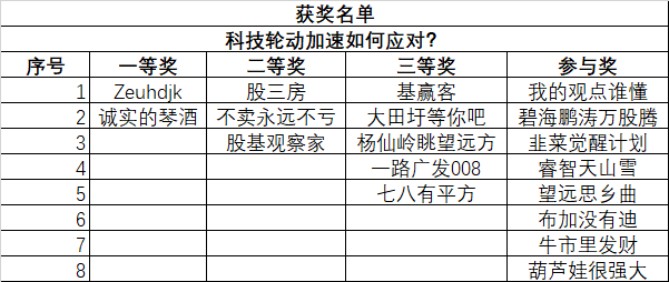 “科技轮动加速如何应对?”活动评奖结果已揭晓!奉上本次活动的获奖名单~恭喜以下小伙伴!