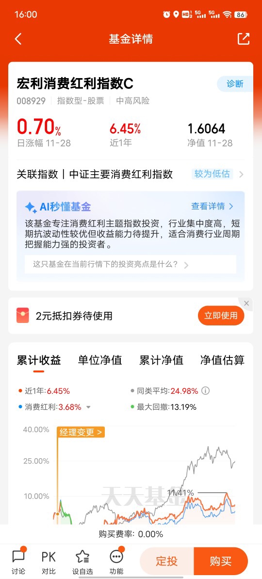 打卡第六天,本周大盘还是在3900点上方震荡,2025年就剩下一个月就结束了。今年的A股市场对于投资者来说是有利的,以科技赛道为主线引领着全市场上涨。到年底了,或多或少大家都会赚点。而目前消费板块估值较低,对于明年的展望,消费板块还是值得让人期待的。本周$宏利消费红利指数C$ 上涨0.77%,近一月上涨1.83%。该基金今年以来上涨5.88%。就像我说的一样,在今年这种市场中,消费板块也略涨,按照估值看,它还是会回归正常估值的,甚至会高估,所以未来它的上涨空间还是很大的。@宏利基金