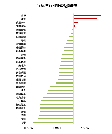 l 过去一周(2025.10.13-2025.10.17),主要宽基指数高位震荡调整。上证指数下跌1.47%,创业板指下跌5.71%,沪深300下跌2.22%,中证500下跌5.17%,中证1000下跌4.62%,科创50下跌6.16%。风格上,主要风格指数多数回调,其中金融(+1.57%)风格有所上涨。从申万一级行业看,上周行业多数调整,其中领涨的行业有银行(+4.89%)、煤炭(+4.17%)、食品饮料(+0.86%),跌幅靠前的行业有电子(-7.14%)、传媒(-6.27%)、汽车(-5.99%)。(数据来源:iFind)