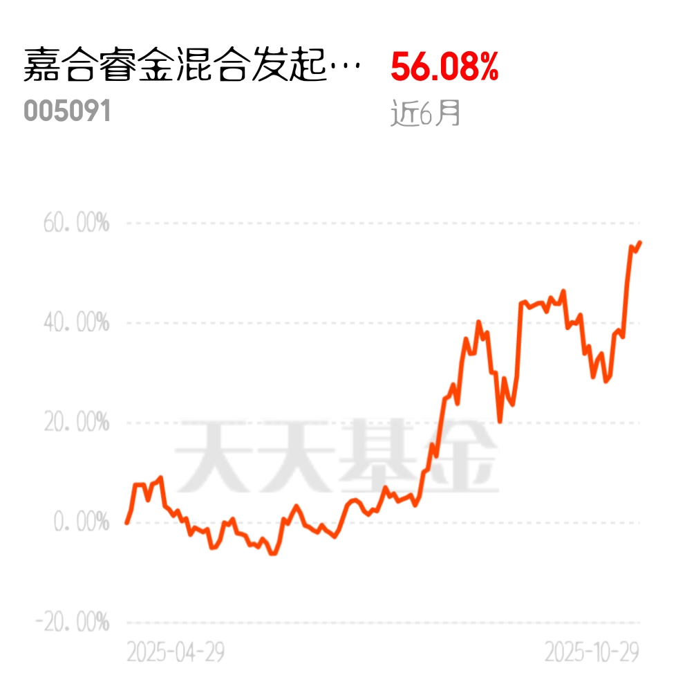 存储芯片因国际断供导致供应减少,CPO也需求大增,价格都在涨。嘉合睿金混合C踩准节奏,近六个月56.08%,一周吃10个点的情况常有。